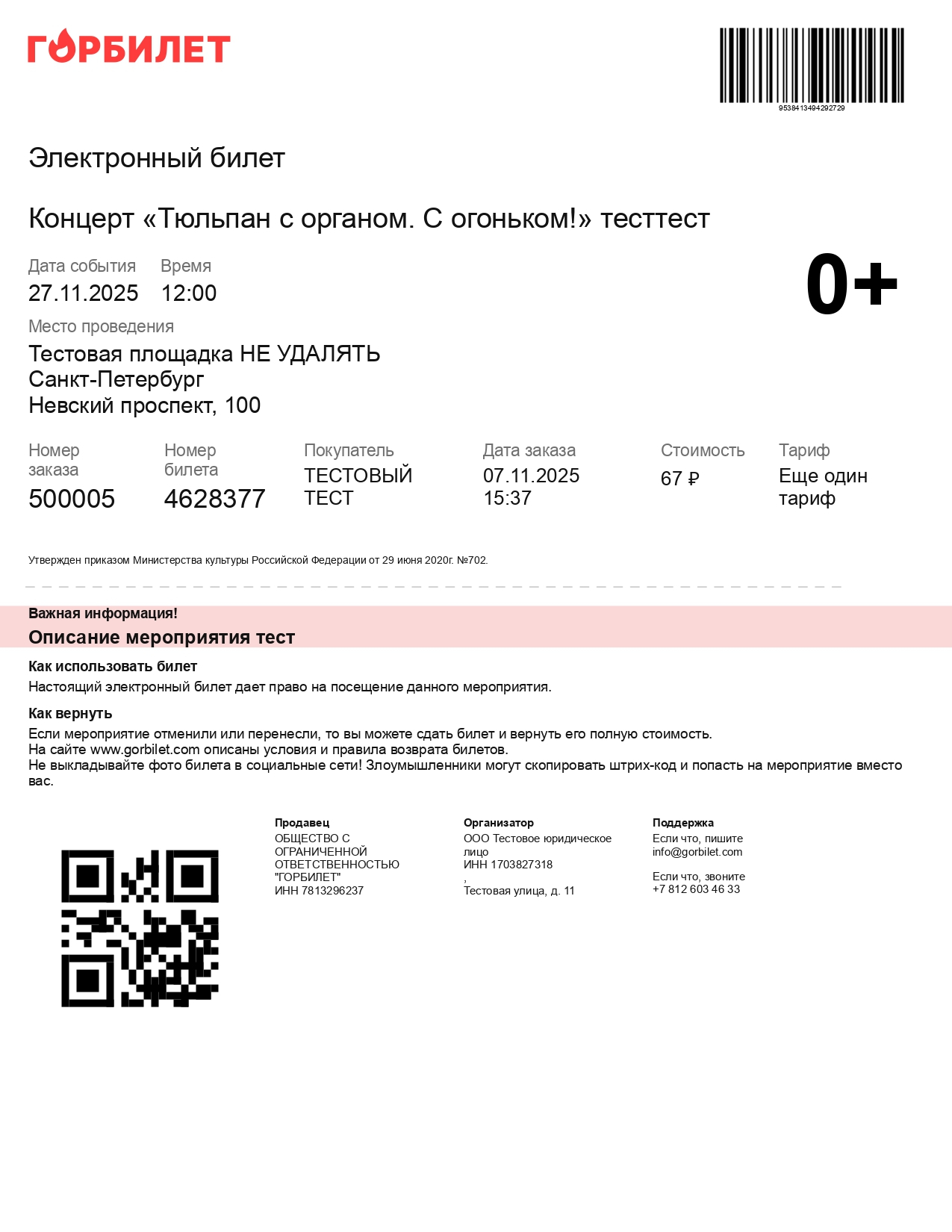 Электронный билет, купленный на официальном сайте театра, на котором представлена информация о мероприятии, будет содержать номер места, стоимость заказа, штрих-код.